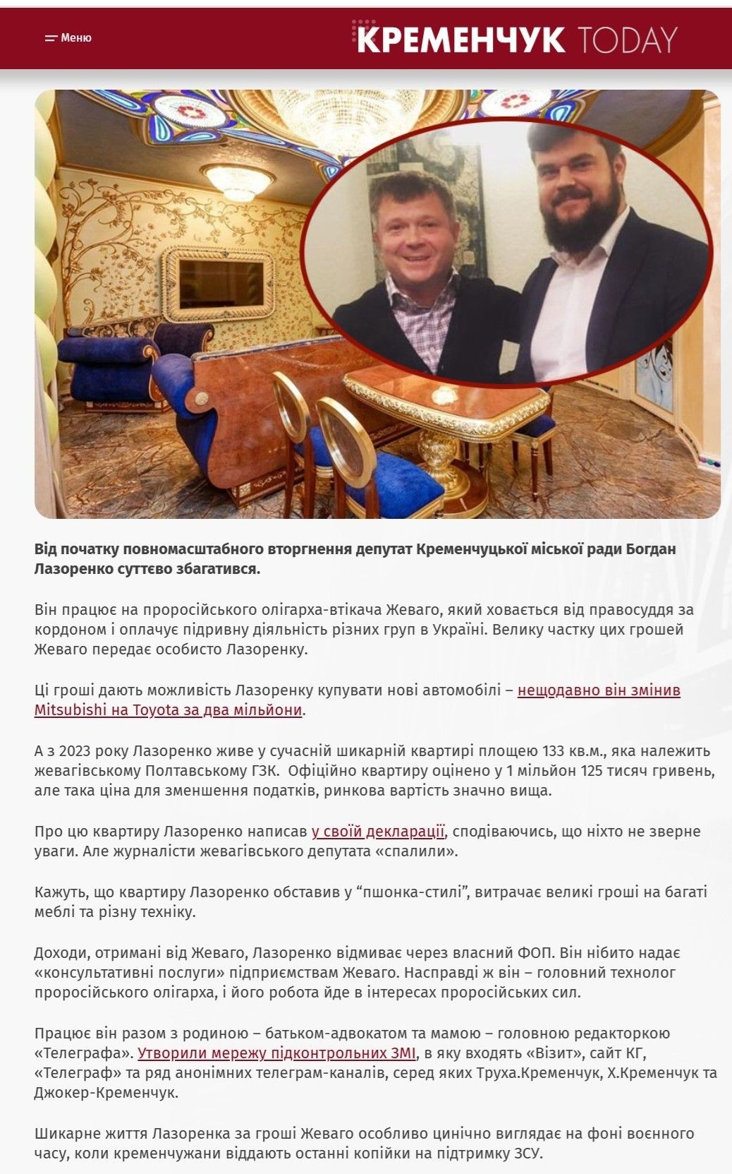 Видання поширило новину з ознаками фейку та чорного піару, що «Кременчуцький депутат Лазоренко змінив прізвище» на Жеваго. В новині із заголовком «Кременчуцький депутат Лазоренко живе у шикарній квартирі Жеваго» видання звинувачує Лазоренка в роботі «на проросійського олігарха-втікача Жеваго, який ховається від правосуддя за кордоном і оплачує підривну діяльність різних груп в Україні. Велику частку цих грошей Жеваго передає особисто Лазоренку».