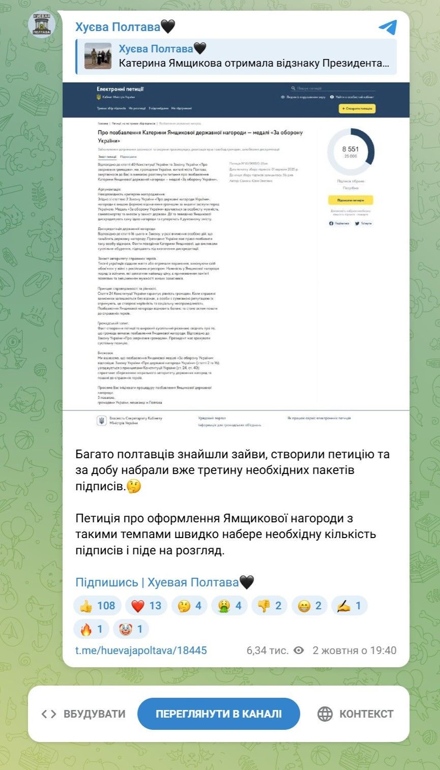 Один із полтавських телеграм-каналів поширив фейковий скриншот нібито з сайту Електронних петицій Кабінету міністрів України, при ньому без посилання на саму петицію. На скриншоті йдеться про нібито зареєстровану петицію зі збором підписів за позбавлення Катерини Ямщикової, в.о міського голови Полтави, державної нагороди «За оборону України».